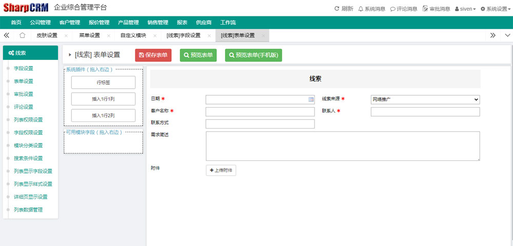 SharpCRM可(kě)自(zì)由拖 ®₩拽字段生(shēng)成自(zì)定義表單
